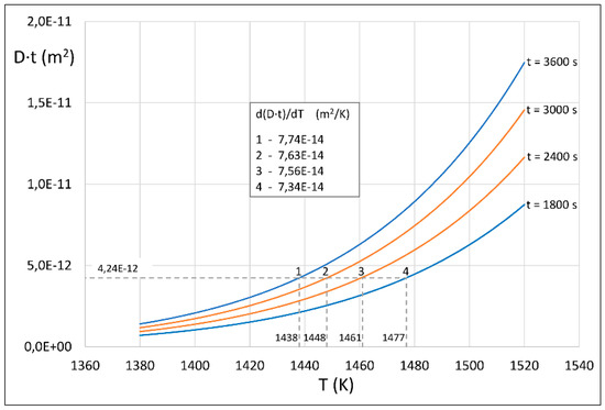 In summary, coupling the results of experimental-theoretical fittings (values of parameter D∙t) with Equation (2) for the diffusion coefficient D, and the literature data for pre-exponential factor Do and activation energy Q, it is possible to:
