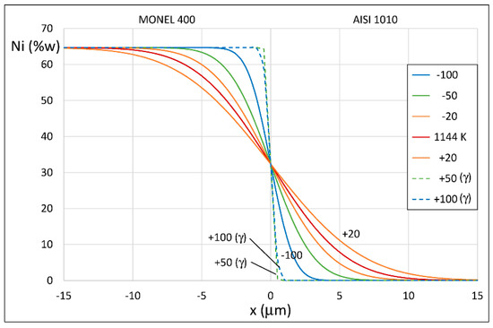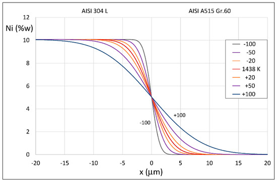 Figure 19 shows the diffusion profiles that were simulated for different values of temperature fluctuations around the equivalent value (1144 K) for t = 3600 s. This simulation differs from the previous ones, in that it presents a change in the properties of the diffusion region, which arises due to positive high temperature fluctuations: for increases in Teq. that are greater than +30 K, the diffusion of Ni leaves the α-Fe field to enter the γ-Fe field, being 1183 K the transition temperature between these two fields commonly assumed for diffusion in iron matrix [35]; the result is the downfall of the diffusion mechanism for fluctuations of +50 K and +100 K, being well represented by the dashed curves in the figure, which would be a particularly insidious phenomenon if arisen during the cladding process.