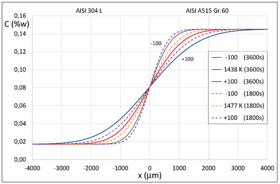 Furthermore, too deep carbon diffusion might lead to detrimental effects that are caused by the formation of decarburized and carburized layers. In this case, the main problem is to avoid carbide precipitations at the grain boundaries. Equation (1) has been used to theoretically simulate carbon diffusion from base steel to cladding austenitic steel, but, while taking into account that C diffusion in the γ-range is strongly concentration-dependent, its diffusivity D cannot be assumed constant varying the concentration. Therefore, the relation for D as a function of temperature and molar fraction that was proposed by Agren [31] has been used, assuming T = Teq. and iterating the calculation of c(x) by Equation (1), so to take into account the effect of carbon content variation on its diffusivity along the diffusion direction. In this way, concentration profiles that have been simulated at various temperatures and diffusion times have been obtained, such as those shown in the Figure 18.
