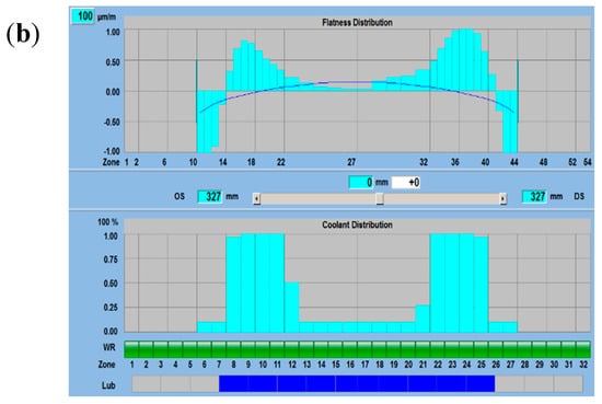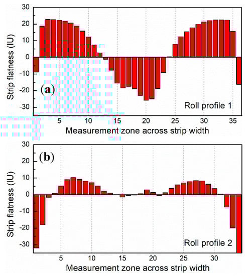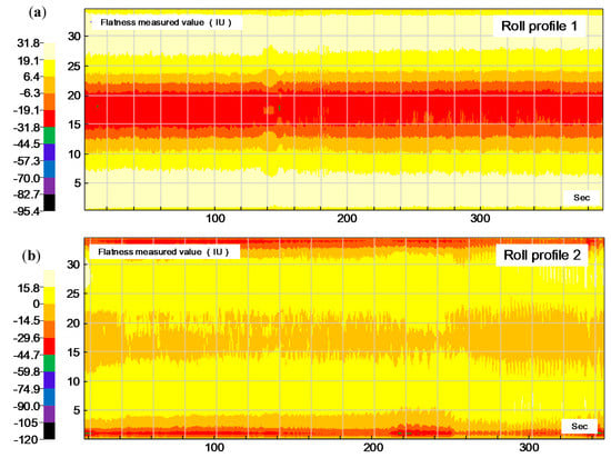 The measured flatness of a certain moment. (a) Roll profile 1 and (b) Roll profile 2.