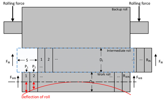 Similarly, the contact pressure between intermediate roll and backup roll is assumed as Equation (13) and Equation (14).