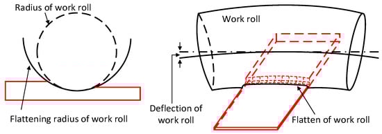 The rolls will deflect and flat during the cold rolling process, and Figure 4 shows the deflection and flatten of rolls. The elastic deflection of the work roll is calculated as in Equation (15).