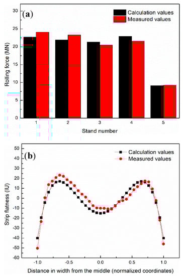 The flatness model is verified in a tandem cold rolling mills, by comparing the rolling force and strip flatness after rolling between the actual measured values and calculation results. The steel sample is DP980 steel, and the experimental parameters are obtained from the Primary Data Input (PDI). Figure 7 provides the verification results. The relative error of the rolling force between simulation and measurement is less than 6.5%, as shown in Figure 7a. Meanwhile, the maximum absolute error of flatness of stand 5 is less than 10 IU, as shown in Figure 7b. The calculation time of the coupling model is two seconds.