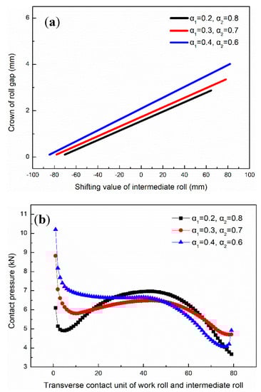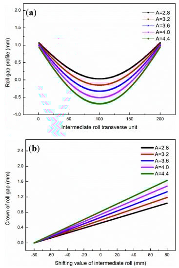 As indicated in Figure 8a, the roll gap crown increased with the increase of A. Figure 8b gives the adjustment range of the roll gap crown. With A increasing from 2.8 to 4.4, the adjustment range of roll gap crown by intermediate roll shifting increased from 1.038 mm to 1.63 mm.
