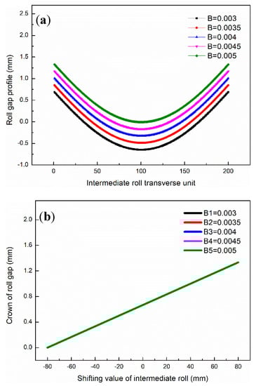 The roll profile parameter B denotes the position of the roll profile relative to the average radius. B cannot exceed 0.005 in order to avoid the excessive difference of roll diameter. According to the manual experience, B is set to 0.003, 0.0035, 0.004, 0.0045, and 0.005. A, C, and Fai are set to a constant value (A = 3.6, C = 80, and Fai = 1.3) when A is analyzed, and the calculation results, as shown in Figure 9. As indicated in Figure 9a and Figure 9b, the roll gap crown and the adjustment range of roll gap crown by intermediate roll shifting were not changed with the increasing B.