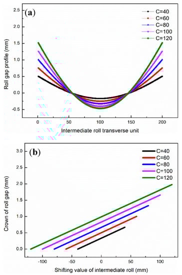 The effect of C on (a) profile and (b) crown adjustment range of intermediate roll gap.