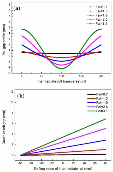 As indicated in Figure 12, with the increase of Fai, the roll gap profile transformed from quadratic shape to quartic shape, which indicated that Fai had a significant effect on controlling the quadric strip flatness. The adjustment range of roll gap crown by intermediate roll shifting increased from 0.671 mm to 1.979 mm with Fai risen from 0.7 to 3.1.