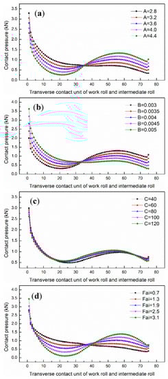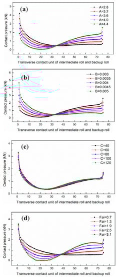 The contact pressure between work roll and intermediate roll under different (a) A, (b) B, (c) C, and (d) Fai.