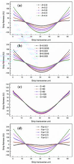 To analyse the profile parameters on strip flatness, the cold rolled strip flatness under different parameters were calculated, and the results are shown in Figure 15. As shown in Figure 15a,d, with the increased of A and Fai, the strip flatness transformed from flat to edge wave. Instead, the strip flatness transformed from edge wave to flat with the increase of B. C had little effect on the strip flatness.