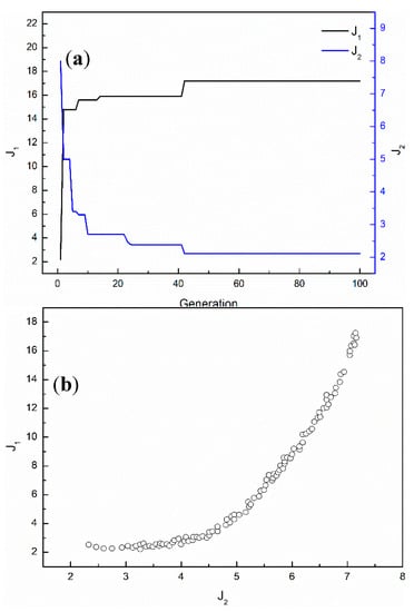Section 3 systematically analyzed the effect of roll profile parameters on roll gap profile, QWI, QIB, and strip flatness. The roll profile parameters should be further optimized by the optimization algorithm. The NSGA-II has been successfully applied in searching the multi-objective optimal solution of parameters of the engineering problem [,], which is used to determine the optimal roll profile parameters in this section.