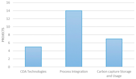 According to Figure 3, several EU Projects have been funded in the Process Integration pathway in order to develop technologies for reducing the use of carbon. For instance, ENCOP dealt with the overall energetic optimization of steel plants [33,82,83]. IDEOGAS focused on injection of reducing gas in the Blast Furnace (BF) and top gas recycling. LoCO2Fe developed a low CO2 iron and steelmaking integrated process route. The identified low-carbon technologies are inserted in the x-axis and for each technology, the number of projects that takes into consideration such technologies is reported in the y-axis.