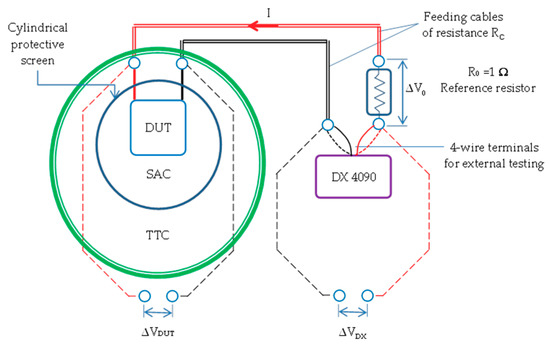 Figure 1 shows the scheme of the experimental arrangement, whose main parts are the Thermostatic Test Chamber (TTC), capable of operating from 203 K to 473 K with a stability of the set-point within ±0.1 K and the above-mentioned z-meter (DX 4090). Only the Peltier modules investigated were inserted in TTC while the other measurement tools such as the reference resistor (Fluke 742A-1, R0 = 1) shown in Figure 1, the voltmeters (Agilent 34420A 7½ Digit) and the thermocouples measurement bench (NI cDAQ-9178, TB-9212) not shown in the figure, were placed outside the TTC and kept in thermal equilibrium with the laboratory. For achieving a Still Air Chamber (SAC) inside TTC, a protective cylindrical screen has been arranged around the Device Under Test (DUT), avoiding on its exposed surfaces the air turbulences induced by the internal fan. At each established TTC set points chosen in the range 363 K, 213 K, the assigned test reference temperature was that picked on the inner surface of the cylindrical screen of SAC.