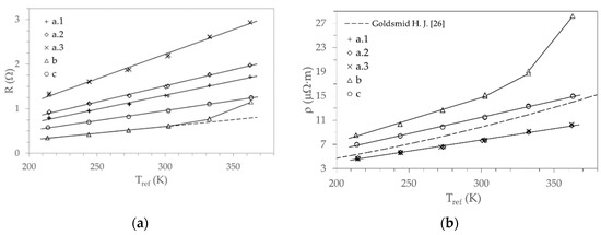 (a) Assembled p-n series resistance R given by Equation (1) versus the test reference temperature for each Peltier module; (b) Equivalent electrical resistivity of the assembled thermoelectric materials versus test reference temperature for each Peltier module. The dashed line represents a possible trend in temperature of the average electrical resistivity for the p and n doped Bi2Te3 bulk materials, as found in the literature [26].