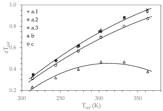 The similar behavior for the Peltier modules “a” is confirmed by the dimensionless figure of merit shown in Figure 3. For these modules, the measured trends zTref as the temperature changes are practically coincident and not so different from that obtained for module c. On the other hand, for module b the resulting figure of merit shows significantly different values and trends.