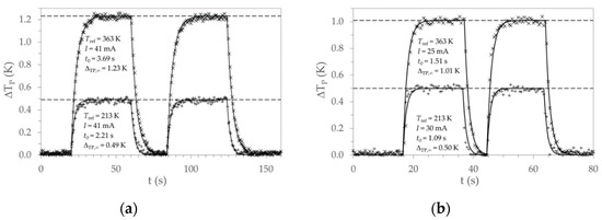 Figure 4 shows the trend over time of the temperature difference for tests at maximum (363 K) and minimum temperature (213 K). Figure 4a,b refer to Peltier modules a.2 and c, respectively. Such a transient temperature difference is caused by the feeding current I, the characteristic time estimated using the DX 4090 is a useful parameter for the evaluation of the asymptotic value . In fact, assuming the time as the parameter that characterizes the response to a step input of a first-order linear system (RC lumped model), it was possible to obtain the best fit of the values and evaluate the asymptotic temperature differences shown in Figure 4a,b with dashed lines. The agreement with the measured values is pointed out through the trends calculated with and , represented in the previous figures by the solid lines that reproduce the two sequential transients established by the measurement protocol of the DX 4090.