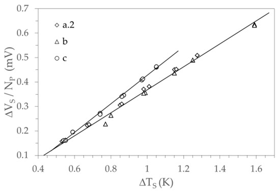 Since the estimated are systematically lower than the actual values of the temperature difference of the junctions, as mentioned at the end of the previous section, a temperature correction has been imposed, such that . In the performed tests, was assigned to modules a.2 and c, and to module b, due to the higher temperature noise noticed. Using the total Seebeck voltage measured at the leads of these modules, Figure 5 shows the Seebeck voltage of a single pair as a function of the estimated Seebeck temperature difference for the junctions. In Figure 5, it is possible to observe the linear trend of the Seebeck voltage with a greater slope in the case of module c compared to modules a.2 and b. The same slope found for the latter two modules suggests similar Seebeck coefficients for both devices.