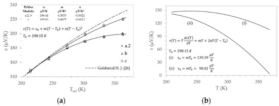 From the equations for , two temperature-dependent relationships were obtained for the Thomson coefficients for module c, and modules a.2 and b marked, hereafter as (i) and (ii) respectively. Figure 6b shows the trends for the Thomson coefficient with respect to temperature, and inside the diagram box the reported relationship refers to both cases (i) and (ii); parameters m and n are those shown in Figure 6a, while is the Thomson coefficient at the reference temperature .