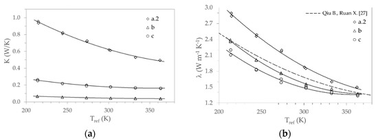 (a) Thermal conductance versus the reference temperature of the test for modules a.2, b, and c.; (b) Equivalent thermal conductivity of the assembled thermoelectric materials versus the reference temperature of the test for modules a.2, b, and c. The dashed line represents a possible trend in temperature of the average thermal conductivity for p and n doped Bi2Te3 bulk materials, as found in the literature [27].