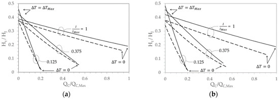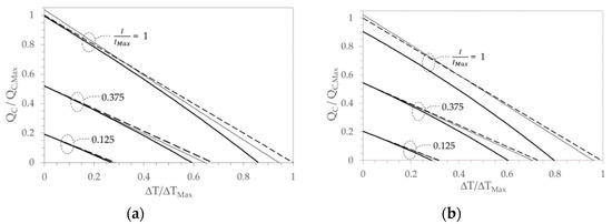 Positive Thomson heat (second term of Equation (5)) plays the role of reducing heat generation by Joule effect (third term of Equation (5)), and both cases (i) and (ii) show a positive Thomson heat at the cold side. Figure 8, for the cases at and , shows the ratio between Thomson heat and Joule effect calculated on the cold side as a function of the relative cooling capacity for different values of the relative feeding current .