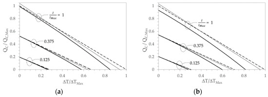 In the previous diagrams, it can be seen that the results obtained with the temperature-independent properties, represented by the dashed lines, show a linear trend with respect to the relative temperature difference The slope depends on the feeding current, i.e., , and reproduces the typical trend proposed in datasheets of commercial devices. On the contrary, the experimental results obtained, represented by the thick solid lines, show the influence of the temperature-dependent thermoelectric properties with an overall reduced cooling capacity, in particular for both high feeding currents, and temperature differences. With a low feeding current there are no significant differences regardless of the assumptions about the thermoelectric properties, while at high currents, a reduced cooling capacity is observed for all the temperature differences between the junctions. When approaches zero, the reduced cooling capacity is caused by the different temperature gradients resulting on the cold side. The temperature gradient is influenced by the temperature profile along the pillars, which depends on the electrical resistivity and thermal conductivity. Furthermore, the thermal gradient on the cold side in the case of temperature-dependent properties is higher than that found in the ideal case of temperature-independent properties. In this way, with the same Peltier heat flux for , the Fourier heat conduction increases. Therefore, with regard to case (ii), Figure 9b and Figure 10b show at the higher current a greater deviation from ideal conditions due to the higher thermal conductivity value (see Table 7), compared with Figure 9a and Figure 10a, which refer to case (i). At the lower currents investigated, this fact was negligible.