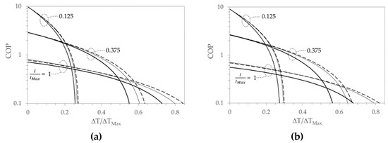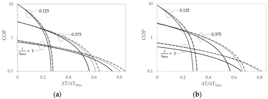 . Coefficient of performance against the relative temperature difference at different relative feeding current , thick solid lines represent the performed experiment, dashed lines refer to temperature-independent thermoelectric properties, thin solid lines denote the scenario in which the Seebeck coefficient is temperature-dependent and both electrical resistivity and thermal conductivity are temperature independent: (a) case (i); (b) case (ii).