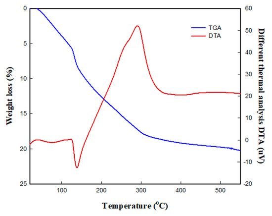 The sample pH was 7.87, which can be attributed to the prior neutralization using basic agents. Thus, the metals in the sludge sample were presented as hydroxides. The solid sample was analyzed by X-ray diffraction (XRD, D2 Phaser, Bruker, Seoul, South Korea); however, there were no significant Cu or Fe peaks detected, which implies the presence of non-crystalline phases of Cu and Fe in the sludge (Figure 1). The thermal degradation of the sample was investigated with thermogravimetric and differential thermal analyses (TGA-DTA, DTG 60H, Shimadzu, Seoul, South Korea). The sample was heated from 25 °C to 500 °C at a heating rate 20 °C/min, using nitrogen gas at a flow of 40 mL/min. As reported previously, the hydroxide form of Cu or Fe can be identified by dehydration within this temperature range [16,17,18]. The TGA curve in Figure 2 displays two major mass loss stages, which corresponds to two different DTA peaks. The first stage between 140 °C and 160 °C shows a ~5% weight loss, characterized by an endothermic DTA peak. This is attributed to the decomposition of Cu(OH)2, forming CuO [18,19], following Equation (2). The dehydration of Fe(OH)3 forming FeOOH took place at temperatures below 350 °C, showing an exothermic peak. The complete decomposition of Fe(OH)3 occurred at temperatures above 800 °C [16,20]. Fe(OH)2 was dehydrated to FeO above 375 °C, corresponding to an endothermic peak [17]. Therefore, the second mass loss between 160 °C and 300 °C could involve the dehydration of Fe(OH)3 to FeOOH and that of Fe(OH)2 to FeO. The significantly higher amount of Fe(III) compared to Fe(II) resulted in a large exothermic DTA peak. The sample was heated at 500 °C and was further analyzed by XRD. The results show the appearance of Cu as both metal and oxide (Cu and CuO), whereas Fe was present as Fe (III) oxide hydroxide FeOOH (Figure 1). The TGA-DTA and XRD results certainly confirmed the presence of CuO and FeOOH, due to the decomposition of Cu(OH)2 and Fe(OH)3 precursors in the sample (Equations (2) and (3)).