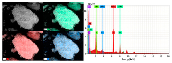 Although Fe(II) phases could not be identified, Fe(II) compounds most probably existed as amorphous phases, or their contents were lower than the detection limit of the analysis. The possibility of Fe(II) phases should be considered, because PCBs manufacturing is a complex process, which can generate both Fe(II) and Fe(III) compounds, such as Fe3O4 [1] or hydroxides such as Fe(OH)3 and Fe(OH)2 [4]. It can be concluded that the main constituents in the sludge sample are Cu, such as Cu(OH)2 and Cu metal, whereas Fe exists mainly as Fe(OH)3 and minor amounts of Fe(OH)2. The SEM image in Figure 3 clearly demonstrates the porous morphology on the surface of the sludge sample, due to the presence of metal hydroxides, and the mapping results show major Cu and Fe and minor Ca peaks (Scanning Electron Microscope-Energy Dispersive Spectrometer (SEM-EDS) Jeol-JSM-6380LA, Jeol Korea Ltd., Seoul, South Korea). The chemical analysis identified Cu (18.34%) and Fe (29.35%) as main constituents, while other metals such as Ca (6.24%), Pb (2.06%), and Sn (1.72%) were presented in lower concentrations.