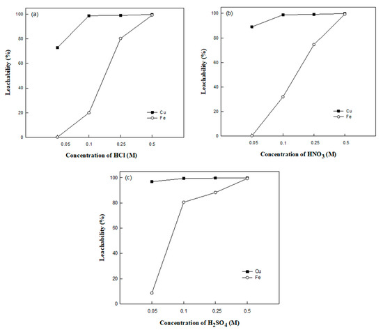 Cu and Fe leachability with variation of (a) HCl concentration, (b) HNO3 concentration, (c) H2SO4 concentration.