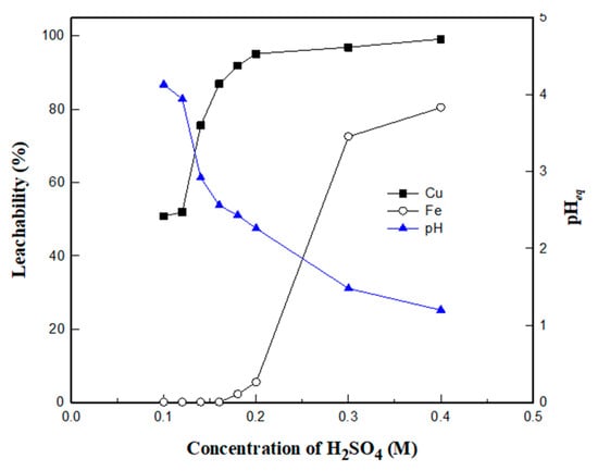 The effect of H2SO4 concentration on selective Cu leaching was further studied in the concentration range from 0.1 to 0.4 M for 60 min at 25 °C. All other parameters were kept constant (shown in Figure 5). At lower H2SO4 concentrations of 0.1 to 0.12 M (equilibrium pH ~4.0), no extraction of Fe was observed and only ~50% Cu was dissolved. Changing the H2SO4 concentration from 0.12 to 0.2 M, corresponding to a decrease of final pH from 3.96 to 2.17, improved the Cu leachability significantly from ~50% to 95%, while the Fe leachability only slightly increased up to ~5%. The critically low Fe leachability at this pH range was explained by the presence of Fe(III) hydroxide as the most major phase of Fe in the sample, which possesses low solubility at this pH (Ksp = 6 × 10−38) [21,22]. Increasing the H2SO4 concentration from 0.2 M (equilibrium pH 2.21) to 0.4 M (equilibrium pH 1.23) did not improve Cu leachability; however, the higher amount of acid dissolved effectively more Fe from the sample (from ~5% to 80.4%). The above results clearly indicate that the best separation of Cu and Fe was obtained at H2SO4 concentration of ~0.2 M. Further studies were devoted to determining the Cu leaching mechanism, neglecting the Fe extraction.