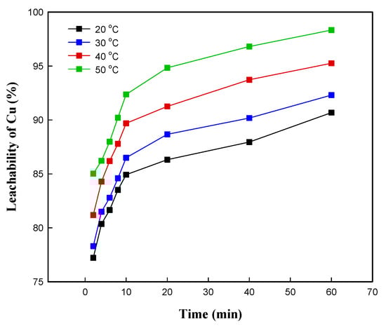The effect of temperature on Cu leaching was investigated in the temperature range of 20 °C to 50 °C and a leaching time of 2 to 60 min, keeping other conditions constant. A 20-g sample in 500 mL of 0.18 M H2SO4 was used. The results plotted in Figure 6 show that Cu leaching increased with reaction temperature and time. Increasing the temperature from 20 °C to 50 °C enhanced the leachability from 5% up to 10%. The efficiency is already significantly high (77.2%) at the beginning of the leaching process and rapidly reaches ~85% after 10 min at 20 °C. The leaching improves only moderately with time, prolonging the reaction time from 10 to 60 min. The change of Cu leachability from 2 to 60 min was similarly observed in all temperature conditions used in this study, 20–50 °C. The leaching data, varying temperature and time, were further employed for kinetic and mechanistic studies based on shrinking core model assumptions.