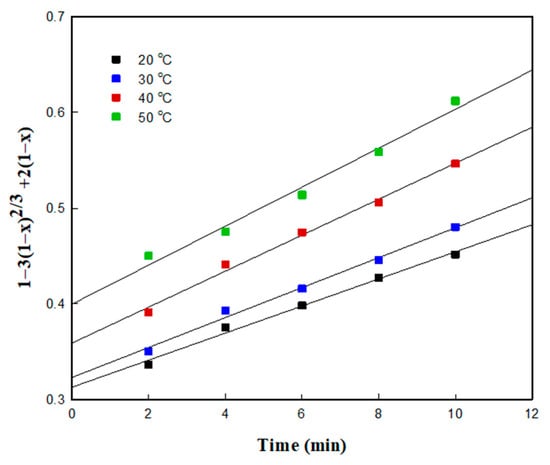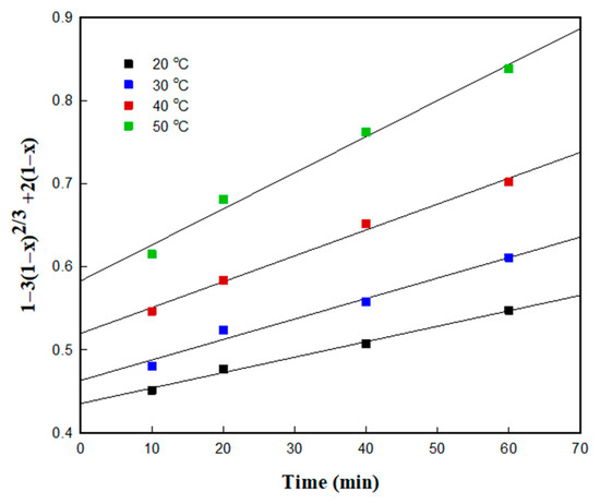 The leaching data from 2 to 60 min were used in each model equation, and the fitted data obtained from Cu leaching did not perform the good linear relationship regarding Equations (4) to (7), showing a low R2 regression coefficient of <0.8. For instance, the plot of [1 − 3(1 − x)2/3 + 2(1 − x)] versus time (Figure 7) indicates that each curve at different temperatures can be divided into two lines, presenting the two stages of the leaching process. This suggested to separate the process into two stages, (2–10 min) and (10–60 min), respectively. The data are listed in Table 2. The film diffusion model with constant particle following Equation (4), did not match well both stages, while the film diffusion model with shrinking particle Equation (5) showed good regression coefficients (R2), but the R2 values for the calculated activation energy (Ea) were lower than those of the other two models Equations (6) and (7). The fitted data of Equations (6) and (7) show better regression coefficients (R2 > 0.97); however, the best match was obtained with the ash diffusion model Equation (6). This model was most suitable to interpret the Cu leaching mechanism since the leaching efficiency was only slightly dependent on the variation of temperature and the activation energy (Ea) values were lower than 40 kJ/mol for all the leaching stages [24].
