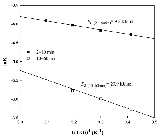 As a result, the fitted data of the ash diffusion model Equation (6) versus time were separated into two different stages (Figure 8 and Figure 9), proposing a mechanism including two leaching platforms. The first stage was defined from the start till 10 min, where rapidly ~85% Cu leaching was obtained. The reaction rate constant varied from 0.0139 to 0.0201 min−1 at 20 to 50 °C, respectively (Table 3). The second stage lasted from 10 to 60 min, with a lower rate reaction constant compared to the previous stage (Table 3), corresponding to a more gradual increase in Cu leaching efficiency. The relationship between lnk and 1/T is presented in Figure 10, and the obtained activation energy values were 9.8 kJ/mol for the stage below 10 min, and 20.9 kJ/mol for the subsequent stage from 10 to 60 min. It can be concluded that the leaching process within 10 min follows the mechanism of ash diffusion control, based on the model equation Equation (6), with an activation energy of less than 12 kJ/mol. The leaching stage between 10 min to 60 min was controlled by an intermediate model mechanism because the activation energy ranged between 12 and 40 kJ/mol [24].
