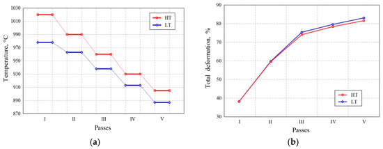 Austenitizing and pre-deformation were completely identical in both variants. The degrees of deformation in all passes of the final deformation were also almost identical. In the LT variant, the final deformation was performed in the temperature range 987–887 °C, with five passes resulting in a total reduction of 83.10%. In the HT variant, the final deformation was also performed with five passes resulting in a total reduction of 82.98%, but in the temperature range 1020–905 °C. The strip was cooled to 560 °C and reeled. The temperature was measured using an optical pyrometer. A schematic of the final deformation is shown in Figure 1.