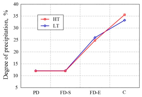 In the final phase of thermomechanical treatment in both variants, the samples were examined after each pass (Figure 4a). The degree of precipitation in the HT variant was lower than that in the LT variant, and for the first three passes, they remained low and were similar for both variants (11.8–12.1%).