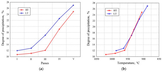 Change in precipitation degree (a) through passes and (b) with the temperature of thermomechanical processing.