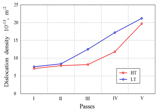 In order to determine the quantitative amount of changes in the structure, a study of the diffraction line profile was carried out. By studying the diffraction line profile in each pass of the HT and LT thermomechanical processing, a significant difference was observed both from the beginning to the end of the thermomechanical process and in each pass in both variants. From the profile of diffraction lines, the density of dislocations, ϕ (m−2), was calculated according to Equation (1).