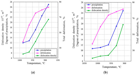 Figure 7a shows that in the LT variant, the degree of precipitation almost linearly increased with the decrease in temperature after two passes. Dislocation density at the onset of deformation increased, but after the third pass, there was an evident slowdown, as can be seen in the values. Figure 7b shows similar tendencies for the HT variant, with the only difference being that a significant increase in the degree of precipitation and deformation occurred after the third pass. Further, it can be clearly seen that a change in the density of dislocations was associated with a change in the degree of precipitation. At the beginning of strain-induced precipitation, interaction of the precipitate and dislocations occurred and the dislocation density increased, as is shown in Figure 8.