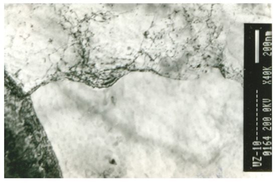 The onset of strain-induced precipitation depended on the temperature, as is shown in Figure 7. In the first two passes, the degree of deformation was high and almost identical for both variants. Static and dynamic recrystallization took place undisturbed, so the dislocation density was lower. When strain-induced precipitation began at 960 °C, the recrystallization became inhibited and the dislocation density increased. In the last passes, the degree of deformation was small, but the density of dislocations increased as the degree of precipitation increased. Precipitates arranged in close-packed arrays became a strong obstacle to the movement of dislocations. Therefore, dislocations became immobile and their density increased.