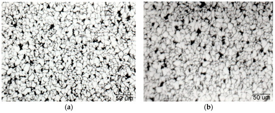 Before the phase transformation, there was enough solute niobium present in the steel to delay the transformation. Specifically, solute niobium delays transformation significantly, which lowers the temperature, resulting in a higher ferrite nucleation rate and lower ferrite growth rate. As the phase transformation takes place relatively slowly, there is a possibility for interphase precipitation. After slow cooling, which occurs in the air, there is a chance for spontaneous precipitation [33]. In this study, it was found that in the HT variant, precipitation of 36.5% was achieved, and in the LT variant, 34% was achieved. As a final step of TMCP, after rolling, both strips (the LT and HT variants) were cooled at the same speed. Precipitation continued, and these precipitates had a beneficial effect in preventing ferritic perlite grain growth. A fine-grained, ferrite–pearlite microstructure with almost the same grain size was achieved (Figure 10).