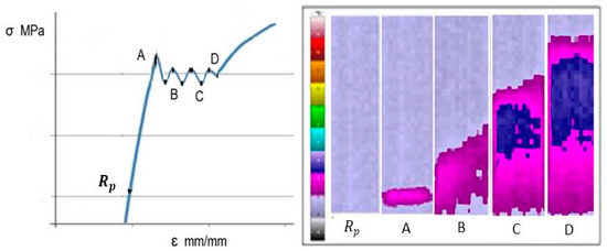 The subsequent cold deformation of the strip shows the appearance of inhomogeneous deformations at the beginning of the plastic flow of the material. These inhomogeneous deformations (stress–strain curve) are related to the appearance of Lüders bands (Figure 11). Specifically, Lüders bands are localized regions of plastic deformation that are often observed in cold-rolled low-carbon steel following the appearance after the limit of proportionality [34,35,36,37,38,39].