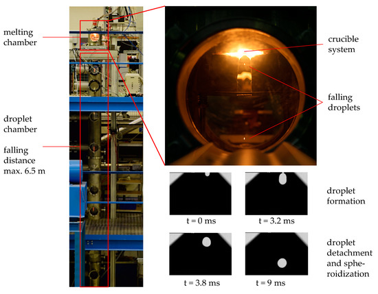 Spherical micro-samples were generated from two different materials using drop-on-demand single droplet generation process. The formed melt droplets were completely solidified during free fall at a fall distance of 6.5 m in an argon atmosphere before they were quenched in oil (Durixol WX61). Figure 1 illustrates the top part of the droplet generator used for the synthesis of samples. The droplets are formed at the nozzle via sending a pressure pulse through a solenoid valve; they detach the crucible with a pressure drop caused by closing the valve. The process is optimized and controlled via computer using a self-developed Matlab script. The formation and detachment process is observed thoroughly during the process using high speed camera ‘i-speed 210’ (Vizaar Industrial Imaging, Albstadt, Germany). The image series in Figure 1 demonstrates the appearance of a X210Cr12 droplet at the nozzle and its further detachment during the synthesis.