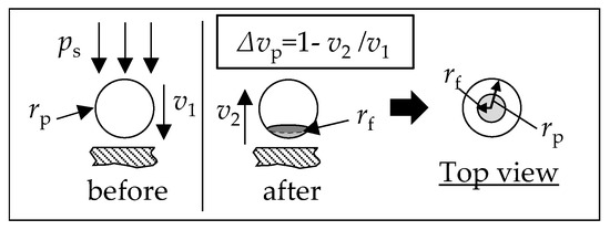 In order to analyze the reproducibility of the particles, particle-oriented peening is used [16]. In this process, individual particles are accelerated using compressed air (jet pressure ps = 4 bar) to impact on a contact plate of higher hardness (hardened 100Cr6; 63 HRC), which is located at a constant distance of a = 80 mm in front of the nozzle outlet. Due to the high velocity impact, the particles are deformed according to their material properties (e.g., hardness or yield strength) [17]. As shown in Figure 2, both the plastic deformation as the ratio of the particle radius rp to the radius of the flattened surface rf and the velocity reduction Δvp (ratio of the velocities before and after the impact) due to the impact are examined. The former quantities are determined by means of a light microscope (Zeiss SteREO.V12 microscope, REOObjective.435200-0000-000, Carl Zeiss Microscopy GmbH, Jena, Germany) before and after the implementation of the process. The velocity of the approaching particle (before the impact) v1 and the rebounding particle (after the impact) v2 are determined using a system consisting of a light barrier (manufactured by “FOS Messtechnik GmbH”), two stroboscopes (“HELIO-STROB micro2” manufactured by “ELMED Messtechnik GmbH”, exposure frequency: 4000 Hz), and a monochrome camera (type “DMK 5 37BUX250” manufactured by “The Imaging Source Europe GmbH”) (cf. [12]).