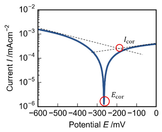 Linear Sweep Voltammetry (LSV) measurement in 0.1 M phosphate buffer with 0.1 M NaCl. Scan rate: 0.001 Vs−1. Corrosion current determined by the Tafel method and corrosion potential are marked.