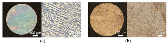After being synthesized, the spherical micro-samples were cleaned with ethanol and dried for four hours at a temperature of 80 °C. The particles were then embedded, ground, polished, and etched in order to check the homogeneity of their microstructure. Figure 5 shows the microsection of the spheres used for this study from two alloys. Due to high carbon and chromium content, the X210Cr12 solidifies with a mainly austenitic microstructure. Between the dendritic structure, primary carbides are formed from the remaining melt during solidification. In comparison, the 41Cr4 steel develops a fully martensitic microstructure.