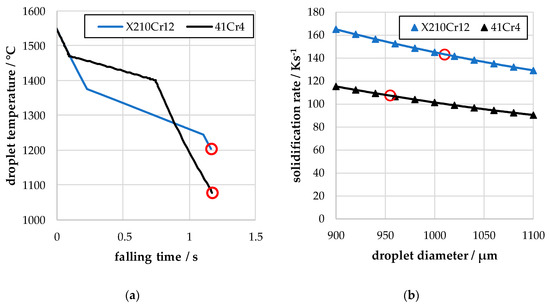 The thermal history of droplets from both alloys was calculated using a previously developed droplet cooling model [24]. Figure 6a shows the thermal histories for the process conditions from Table 1 and the experimental falling distance of 6.5m before the droplets are quenched. Both alloys are fully solid in the argon atmosphere before they are collected in oil. The solidification rate as a function of droplet diameter is shown in Figure 6b. A small variation in droplet diameter (e.g., ±10 µm) will only have a minor effect on the solidification rate (process conditions are marked with red circles). We conclude that microstructure development should be highly reproducible due to this wide process window.