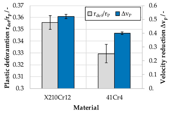 Figure 7 illustrates the plastic deformations rdef/rp and the velocity reductions ∆vp determined for the investigated materials. In each case, the mean values of five experiments are shown. In order to analyze the results deviation, the error bars are used to visualize the maximum and minimum determined value of the test series. While the X210Cr12 shows a plastic deformation of about 0.355 and velocity reductions of about 0.521, the values determined for 41Cr4 are significantly lower. A plastic deformation of 0.330 and a velocity reduction of 0.400 were calculated for 41Cr4. For both of the presented results variables, maximal relative standard deviations of 3% were determined.