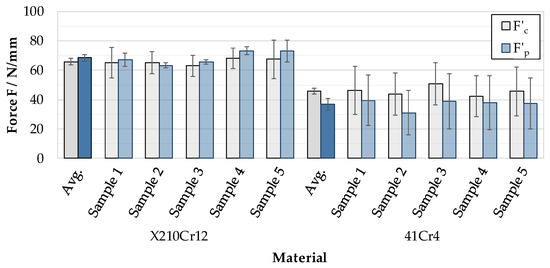 Figure 8 represents the average specific and thrust forces (displayed in opaque bars) obtained in cutting experiments for the two sample materials as well as the individual mean forces for each sample (displayed in dotted bars). The standard deviation of each sample represents the standard deviation of the forces obtained for 15 individual tool engagements, while the standard deviation of the average force (“Avg.”) represents the standard deviation of the mean forces of five samples respectively. The X210Cr12 alloy shows distinctively higher cutting and thrust forces than the 41Cr4, indicating a higher shear strength of the X210Cr12 compared to 41Cr4. Compared to the results of the particle-oriented peening, it can be assumed that the material behavior for shear-dominated loading mechanisms differs from the behavior under impact/normal loading, where the 41Cr4 alloy shows the smallest plastic deformation and therefore a higher resistance to normal strain.