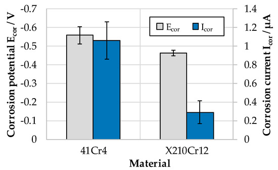 The corrosion current also shows very clear differences and a high reproducibility for all samples (Figure 10). 41Cr4 samples shows higher corrosion current compared to that of X210Cr12 due to the lower chromium content. These electrochemical descriptors show high reproducibility and expected behavior for the two materials. Both materials can be significantly distinguished by the measurements and the determined characteristic values.
