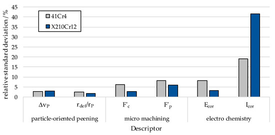 To evaluate the reproducibility of properties, the relative standard deviation of the descriptors was determined (Figure 10). The particle-oriented peening descriptors show very good reproducibility, with standard deviations smaller than 5%. The micro machining of individual spheres shows good reproducibility, which is in the same order of the corrosion potential Ecor. The corrosion current shows an increased standard deviation, which is due to the low values of corrosion current and the resolution of the measurement device and not to the low reproducibility of samples since the corrosion potential is reproducible.