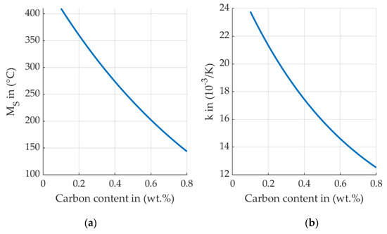 where is the martensite fraction, is the martensite start temperature, and is the Koistinen-Marburger coefficient. Material and phase transformation parameters were implemented as carbon and phase dependent, see Equations (7) and (8). Exponential dependency of first order on carbon content is assumed for martensite start, MS, and for the Koistinen-Marburger parameter k, see Figure 1.